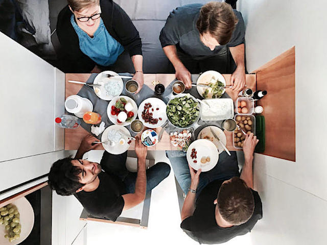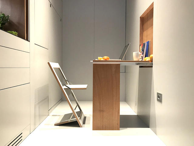 麻雀雖小,五臟俱全,看似一無所有的空間,其實所有家具都隱藏在牆裡,生活機能一樣都沒少;想睡覺時,將折疊床拉下來就好,床頭還配有閱讀燈供睡前閱讀,將櫃子移下來即可加寬變雙人床;小廚房裡頭有電磁爐、水槽、伸縮式水龍頭,檯面下還有台小冰箱,對面牆板拉下來就是餐桌和椅子,可供四人用餐,不必擔心每次吃飯時都孤單一人;