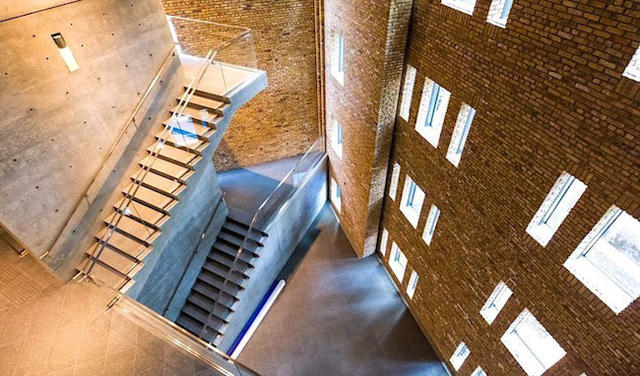 光線從一扇扇的玻璃窗流洩入內,形成光影恣意嬉戲的明亮空間,優雅又具現代感的氛圍,讓建築本身成為一項藝術品。循著玻璃和鋼築起的樓梯扶手來到頂樓的露天展覽區,最上方是新蓋的屋頂,採用落地玻璃窗圍繞四周,模糊室內外的界線,也將綠意生命力引入室內,溫馨、優雅,有家的感覺;在沉靜的外觀之下,多元化的空間設計得以讓人們在此舉辦各式活動和展覽,極大化單一空間的價值。
