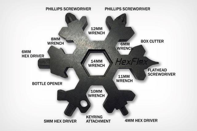 這款令人難以置信的非常適合季節的多功能工具由不銹鋼製成,配有兩把十字螺絲刀,一個平頭螺絲刀,三個六角扳手,一個盒式切刀,一個開瓶器,以及六個不同的扳手,巧妙地融入其雪花形的設計中。HexFlex 最初設計為滑雪板工具(因此是雪花主題),實際上也適用於日常使用。它固定在你的鑰匙圈上,讓你可以隨身攜帶它,讓你有能力從瓶子到盒子打開東西,擰緊或鬆開螺絲,和螺栓。非常酷不是嗎?!