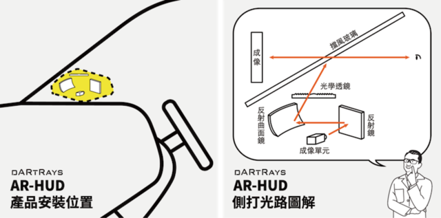 將 HUD 結合 DARTRAYS 獨創的「側打光路」技術,便能大幅縮減產品體積,並達到距離範圍更遠、也更清晰的 AR 投影效果。