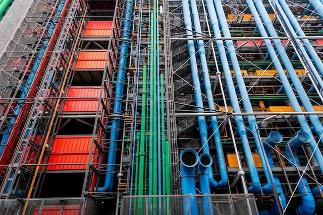或許遠看你會覺得這是一棟尚未蓋完的未完成品,但這就是龐畢度中心的特色之一 !鋼骨外露、以顏色編列直接外顯展示建築體本身的運作。如:藍色代表空調管線、黃色是電氣循環管線、綠色是水管管線、紅色是手扶梯與電梯管線,獨特且直接的建築創意也徹底改變傳統建築設計的基本概念。