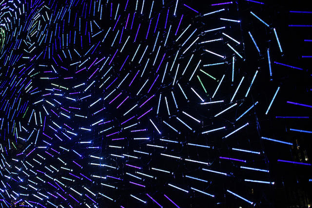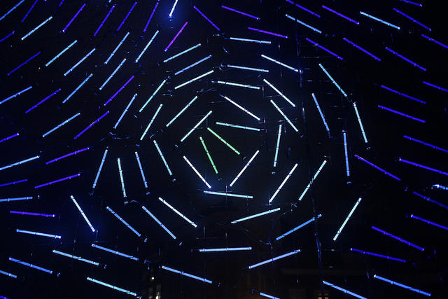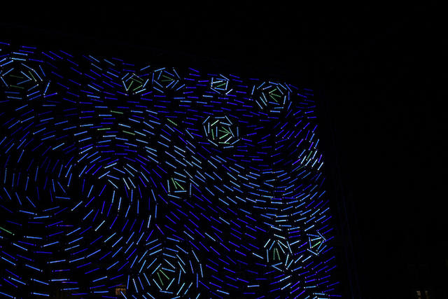 從遠處看,這件燈光裝置藝術看起來和梵谷的星夜十分相像,但是當遊客們靠近、凝視著這些發著光的漩渦,就能感受到隨著壓克力棒的角度不同,光線看起來更具有動態感,讓人一不小心,就會被這光之漩渦給捲了進去。