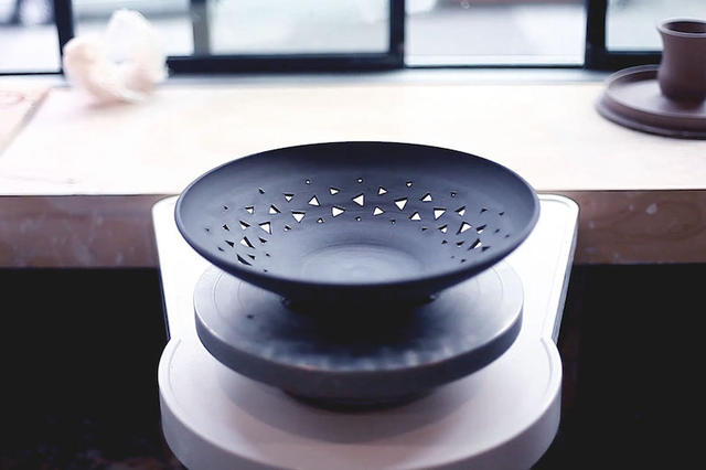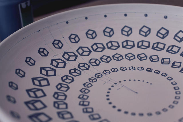 來自 Turn Studio 的陶瓷藝術家 Kenny Sing,從事陶瓷創作已經很多年,他將旋轉動畫 Zoetrope 運用在陶瓷創作中,創作了一系列的淺盤。在他的作品 Trepō 中,他將用電腦繪製而成的數位圖案,轉化成陶瓷盤上獨一無二的圖案,然後將這些圖案從表面切割或上釉,當啟動陶輪時,這些看似靜態的設計元素,就會頓時活了過來,正方形、三角形、長方形等各種幾何圖形,跟著盤子一起不停旋轉,看起來就好像一個動態的漩渦,隨時就要把這些圖案給吞食進去。