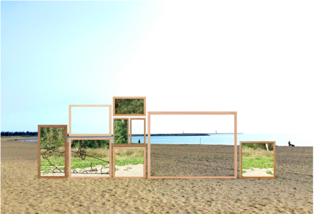 出遊拍照合影的習慣,從前到現在無一不是,此件作品由大大小小的相框象徵回憶組成一座山形,有些框出漁光島美景及正在島上嬉戲的人們,有些則為鏡面貼上老照片輸出,同時反映著正在島上玩耍的人們及舊時秋茂園老照片裡的元素及內容,例如:奇異的神仙雕塑、牧童騎在水牛身上等。本件作品為民眾參與活動之一,於前製期辦理「 徵選老照片 」活動,最後集結選出最具代表性與秋茂園經典的合影,將這些老相片中的元素整合濃縮,重新輸出進大大小小的框中鏡面上,使現在在島上遊憩的人們與秋茂園風光時代的風貌同時合影,讓曾經的歡樂出現於現在,將現在的合影留在未來。