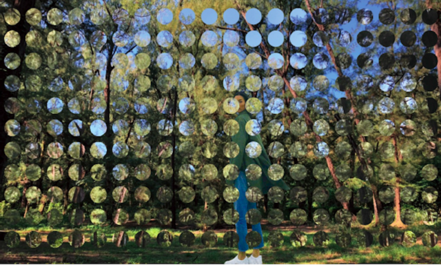 漁光島曾是台南市中心最僻靜的小漁村,也是在地人的秘境,過了漁光大橋,可以感受到氛圍的變化,彷彿進入另外一個世界,寧靜而閒適、讓人得以忘卻憂煩。相較於寬闊的海景,作為海陸中界的防風林,給人與海灘截然不同的感受,走在防風林裡,群木圍繞,光照被稀釋了許多,綿延的通道看不見盡頭,使人有一種進入未知世界探索、既驚又喜的感受。如果說海灘帶給人的是海闊天空的鬆弛奔放,那麼防風林,則是使五感變得更為敏銳;「秘鏡」在防風林之間利用矩陣排列的鏡面裝置圍塑出一個圓形空間體,整件作品因鏡面裝置反射週邊的景象,並使風景交疊在一起,形成奇幻的視境;鏡面裝置也使得作品本身彷彿融化在環境裡消失了一般,以一種最低的存在感去反映並且突顯環境的存在;當觀眾靠進作品時,會看見自己的影像反射在被分割的鏡面裝置裡面,呈現出的不完整的形體,在存在與不存在之間,體現我們與自然不可分割的關係。