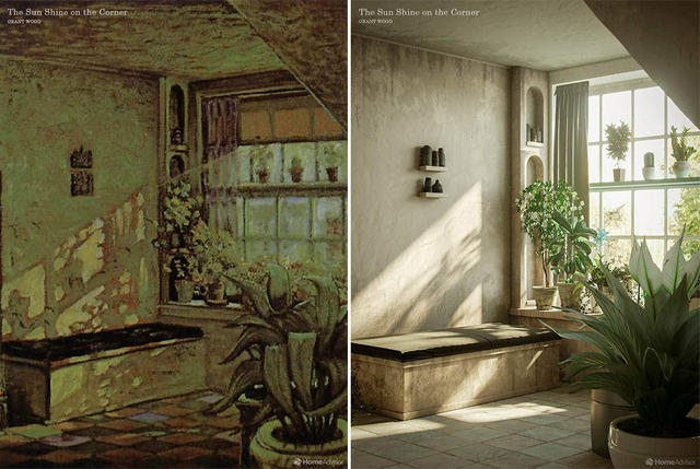 (左)美國新通俗寫實畫家伍德 Grant Wood畫作《The Shine On The Corner》與(右)Homeadvisor、NeoMam實體化