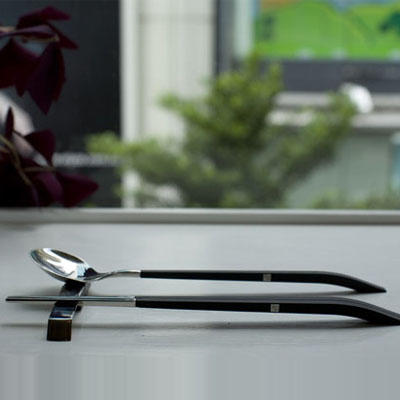 而一雙單純的筷子能怎麼在設計上表達中華文化?宋徽宗的書法瘦金體浮上設計師的腦海,瘦勁而不失其肉的筆跡,轉化成剛柔並進的筷枝流動線條,黑色的耐熱塑膠擬態墨色,拼接不鏽鋼增加現代感,握柄處彷彿呼應了書法收尾的筆觸,也將使用者習慣考量在內,設計出方便拿取和支撐的厚度。