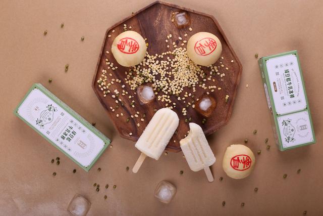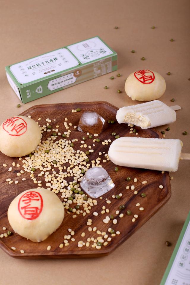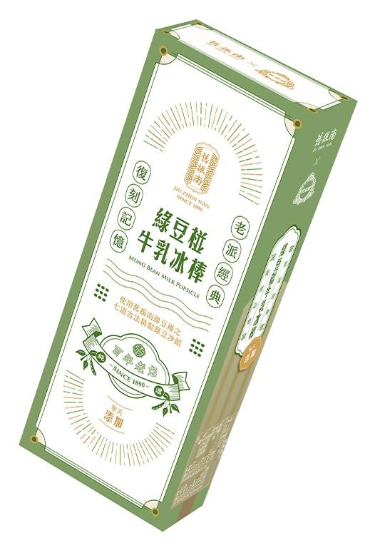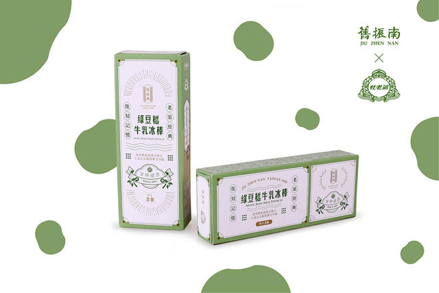 這次為搭配綠豆椪牛乳的傳統口味,包裝設計充滿童趣、懷舊氛圍,以往包裝上常見的對聯「真材實料、童叟無欺」改成了「老派經典、復刻回憶」的字樣,帶點霧灰的綠色主調不僅重現綠豆的色彩樣貌,不過度飽滿的色階也帶我們重回童年回憶,彷彿看見了國小生字簿的封面,更打造復刻經典的樣貌,吃冰同時也能感受到濃濃的懷舊滋味。