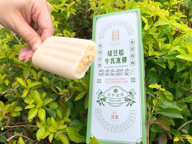 「舊振南綠豆椪牛乳冰棒」採用舊振南經典清香綠豆沙餡,搭配黑糖風味的寒天,其中清香綠豆沙餡是招牌商品綠豆椪的菁華,嚴選中顆飽滿綠豆仁,經過泡、洗、濾、蒸、壓、煮、炒七道繁複手工程序,製成酥鬆綿密的餡料。