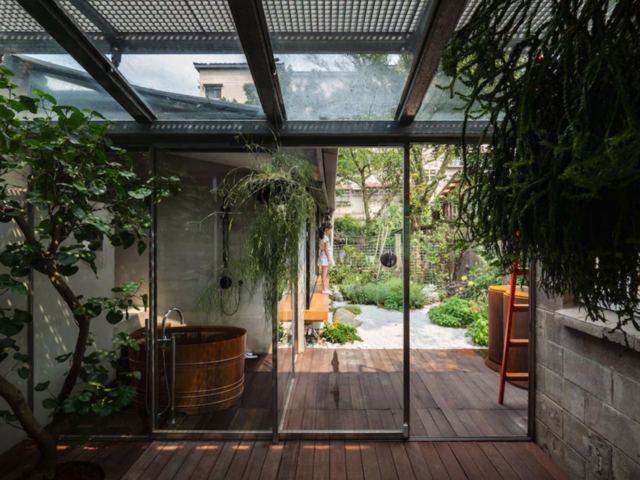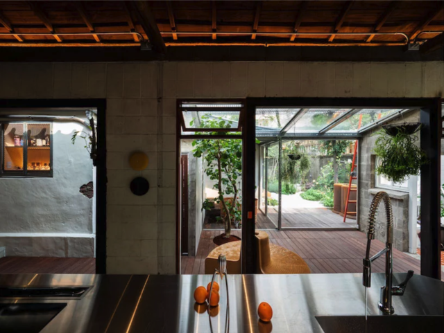 這座建築興建於明治時期,於 1950 年代曾進行過增建。設計團隊小心的將老屋內原有的日式木造窗框、大理石地板,以及於後院生長的藤蔓,保留了下來,與懸掛在客廳椽木上的大型環狀吊燈、象徵著吉祥的紅色前門等現代裝潢,形成對比。增建的部分,在設計團隊手上,變身成作為公共空間的廚房和客廳,透過入口處的長牆,分隔出公共與私人領域,並藉由插入玻璃牆和天花板,進一步模糊室內外空間的界線,形成可以供小孩自在活動、大人們也有其隱私的開放式空間。位於室外的紅色階梯,則成為不用出門就能遠眺街廓的跳板,即使不出門,似乎也沒有與世界隔絕。