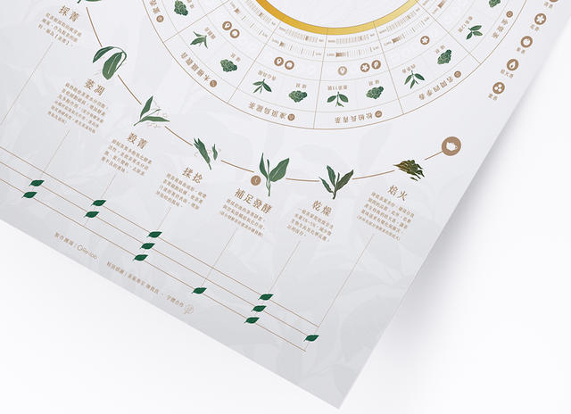 「茶顏觀色」海報以畫面中心如同台灣島嶼形狀的茶葉作為視覺的第一落點,外觀則以一圈圈、一層層的設計承載著各種茶葉的知識訊息,各地農會及茶改場專家的協助下,從茶色、沖泡溫度、產地、香氣到茶葉烘焙後的形狀等等細緻講究的資訊,循著感官體驗,俐落明快地在圖中相對應說明得到解答。圈層主體下方則說明了烘焙茶葉的過程以及分類,傳遞台灣茶學的基礎知識。