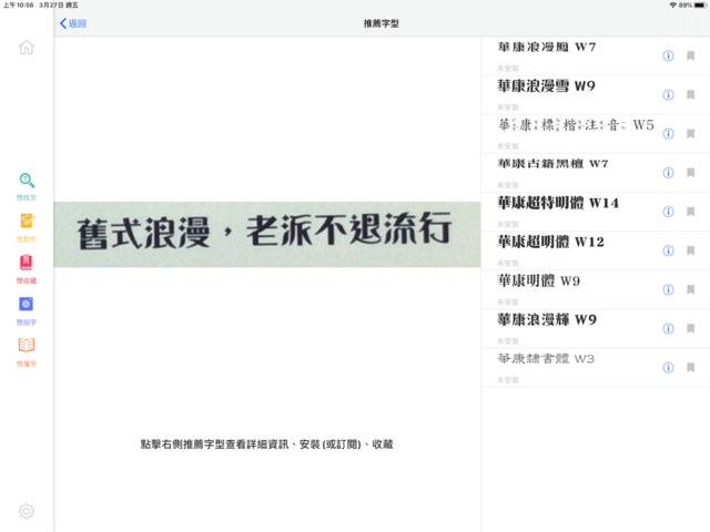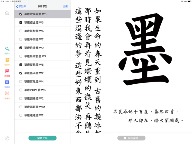 華康字集 App即日起可在蘋果App Store下載,下載後即可於App內使用「華康瘦金體」、「華康翩翩體」與「華康手札體」三種字型。用戶可另透過訂閱使用本服務提供之所有字型,於iPad其他App內自由應用。