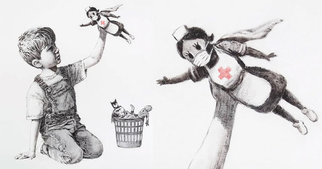 在畫面中,可見一位小男孩以跪姿開心地玩著白衣天使的布偶,而一旁被擱置於籃中的其他玩偶則是超級英雄系列角色的蝙蝠俠、蜘蛛人,用以表達在新冠肺炎肆虐的期間,孩童(甚或每個人)心目中認定的英雄是支援前線的醫護人員,彷彿只要有他們的存在,世界就能免於崩毀的危機,溫暖地表達對他們的支持。而前述提及畫作受贈且展示的地點就位在 University Hospital Southampton 的急診室走廊,Banksy 也罕見地留下訊息:「謝謝你們所做的一切。希望這幅畫可以點亮這個地方,即使這幅畫是黑白的。」
