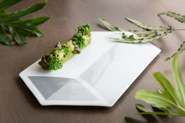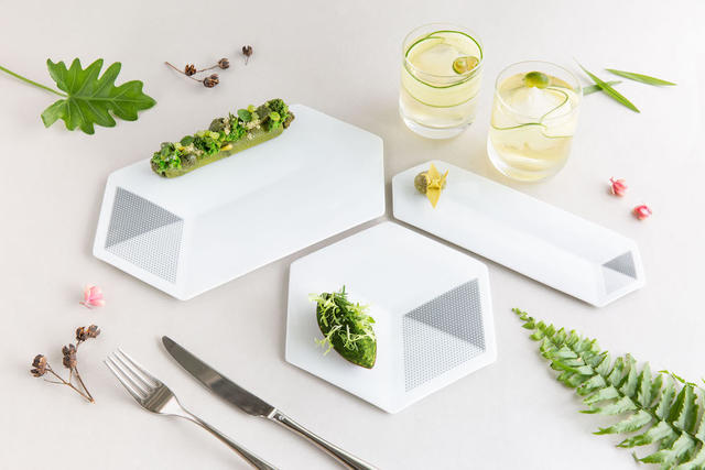 北美館在1983年建成,建築師高而潘採用交錯的管狀建築結構,縱橫交疊出展覽空間,試圖演繹傳統建築的斗拱結構,層層架疊的長方體則抽象呈現如四合院環抱庭埕的空間感。設計師洪忠權從「白色、立方、模組化」等關鍵字發想,運用六角形白瓷搭配灰階網點,設計製作共三款尺寸的瓷盤,巧妙捕捉白色建築體的透視角度。長寬互異的瓷盤,在餐桌上組合拼排,就像遠望北美館一樣,成為餐桌上的微觀風景。