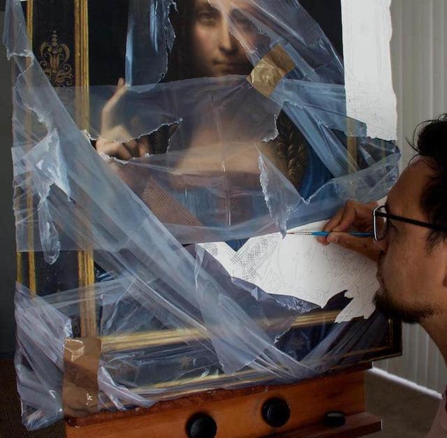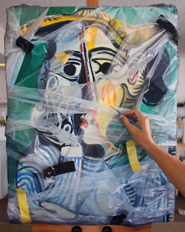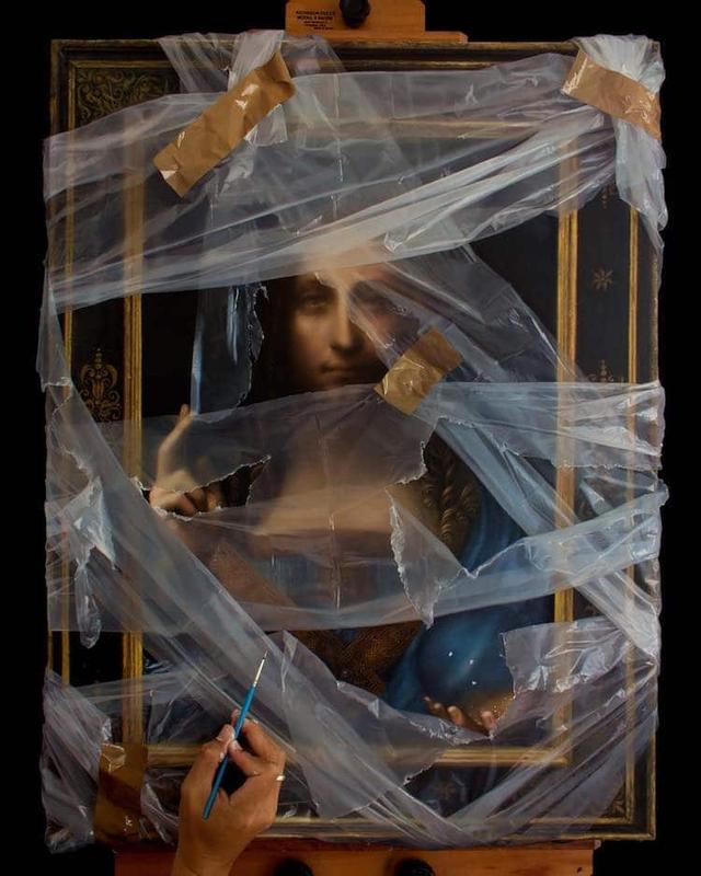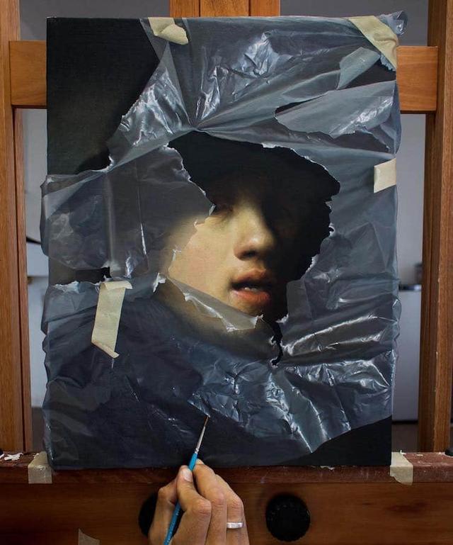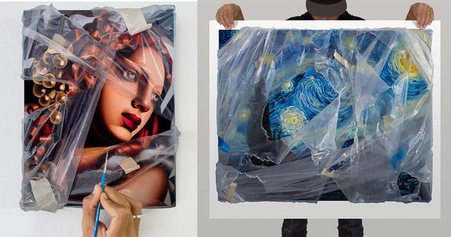 美國洛杉磯藝術家 Robin Eley 最喜歡玩弄大家的眼睛,特別是他超寫實的繪畫風格,精準得拿捏光線在塑膠薄膜上的每一個反光,總是能輕易騙過觀眾的眼睛,信以為真。最近他推出了一系列油畫作品,乍看之下,很容易讓人以為是一幅幅用塑膠薄膜包裹著的世界名畫,被拆到一半,殊不知,從塑膠薄膜、膠帶到塑膠薄膜中的世界名畫,全都是Eley自己一筆一畫畫出來的,如此神人般的繪畫技巧,怎能不讓人讚嘆。