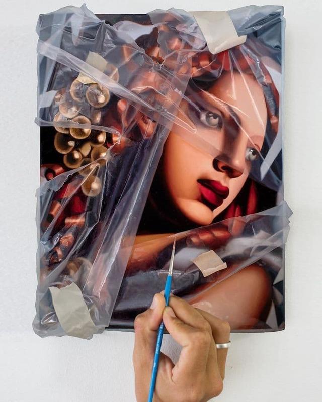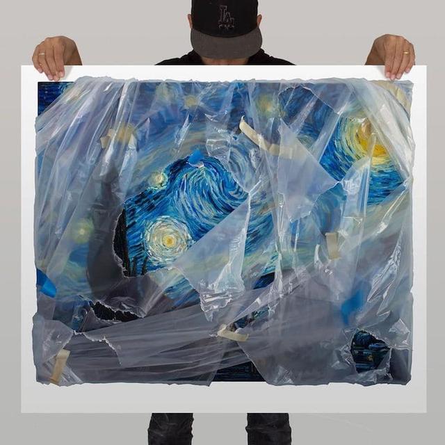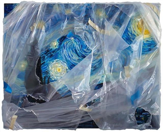 在這系列作品中,最令人驚艷的莫過於他重現了梵谷的《星夜》,Eley 不只準確的捕捉了後現代派的繪畫技巧,還在《星夜》外加上一層從中間被撕開的反光膜,栩栩如生的樣子,直逼電腦特效的水準。而另外一幅由 1920 年代畫家 Tamara de Lempicka 所創作的《The Brilliance》,帶著現代感、幾何風的裝飾藝術風格,到了他的手上,也是超水準發揮。Eley 之所以會在這些名畫外頭加一層塑膠薄膜,其實是為了展現現代世界中的孤離感,就像是「你可以看到,卻不能感覺到」的感覺,這些美麗的畫作被刻意包裹起來,增加吸引力,而觀眾們明明希望能將畫作外的保護層撕開,好看個清楚,卻永遠也無法做到。