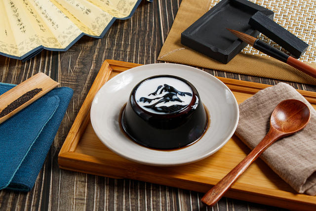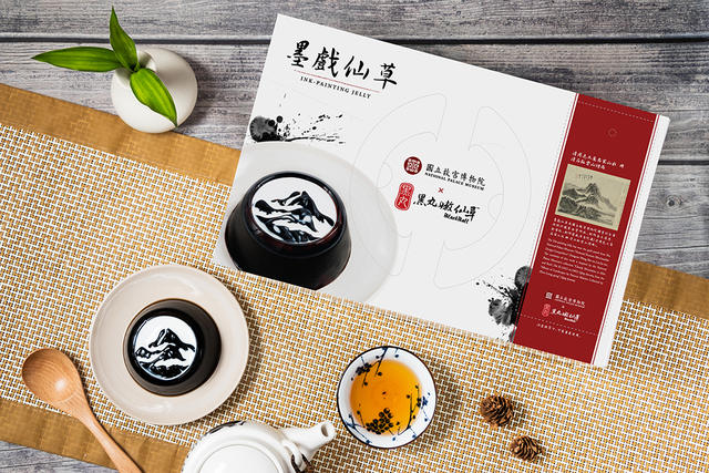故宮表示,2010 年起舉辦國寶衍生商品設計競賽,並將具市場發展性的得獎作品商品化,提升博物館文創產值、開創新生活美學。此次搶鮮上市的「墨戲仙草」,是去年第八屆國寶衍生商品設計競賽金獎作品。得獎者王蓓恩、劉家欣將故宮名畫〈清 石谿 雲山煙雨〉搖身一變成為經典甜品仙草凍,當奶球淋在仙草凍上,增添風味的奶精流動於層層峰巒,在黑白相間中交織光影流轉的山水詩意,創意玩轉故宮名畫的感官體驗。