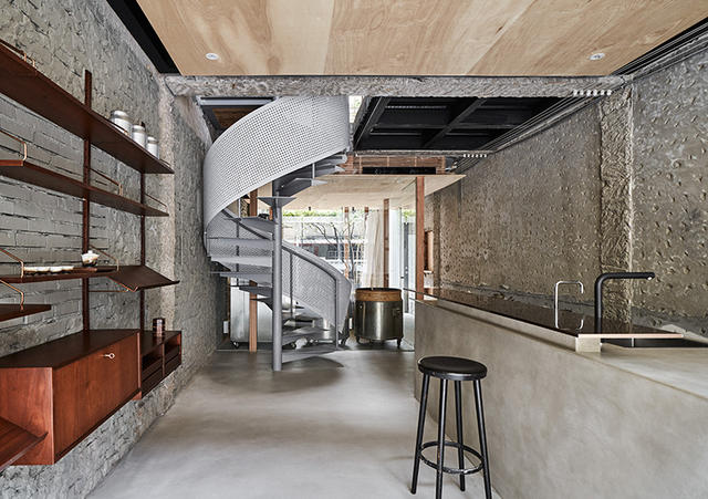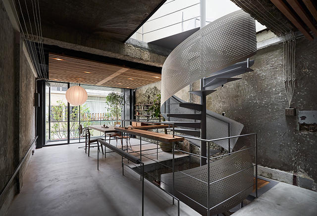 此間最大的硬體改造在於樓梯的形式,原始樓梯為混凝土折梯,但由於原始樓梯遮蔽過多的視線影響上述的透明感,我們希望引天光入室,因此在三樓頂開了一處天井,在這樣的前提下,一座具備通透感與姿態的旋梯是最適合的設計,旋梯的姿態如同大樹,搭配像彩帶一樣的洞洞板,讓樓梯能轉化為空間中向上飛舞的優美造型。