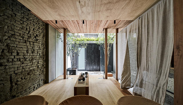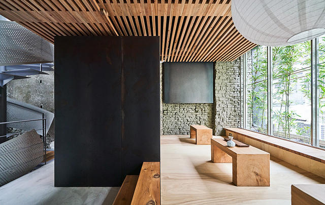 另外,在戶外選用「燒杉」作為主要建材的用意也是搭配「碳焙」的主題,讓「燒」這個感受能夠延伸並聯想到茶葉,因為大部分的茶葉都與「火」有關係,燒杉能夠呈現原始東方建築文化處理實木乾燥的質感,時常運用在東方傳統建築中,非常適合茶空間,因此選其為主要外飾材料。