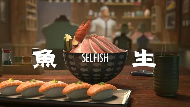 華燈初上,今晚我想來點…生魚片配醬油芥末嗎?在享用大餐前不如先試著走進由台灣新銳動畫導演陳柏謙,用 3D 動畫技術所打造的《 魚生 Selfish 》擬真時空,在宛如深夜食堂的動畫場景裡,日本料理店的熱鬧氣氛迎來絡繹不絕的老饕食客,日本料理師傅在吧檯忙進忙出,配合點單供應的豐富菜色應有盡有。
