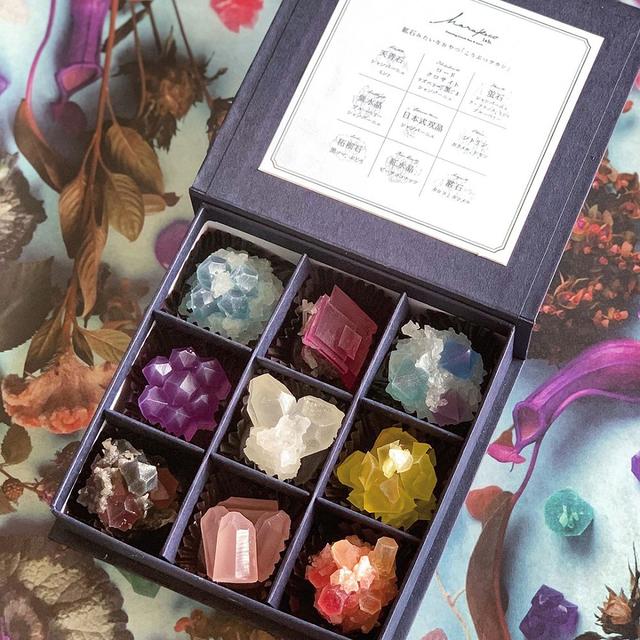 「Koubutsuwokashi(こうぶつヲカシ,意為礦物和菓子)」是搜尋琥珀糖一定會推薦的店家,在 IG 上更是高人氣。打開每個琥珀糖禮盒都是驚喜,設計成不同顏色的礦物造型,光亮透明搭配稜角分明的刻面,精緻的擬真製作就像是珠寶盒。各款琥珀糖都代表不同口味,清單也貼心地標示於盒內,另外附上卡片及包裝袋,當作禮物心意十足又體面,難怪大家收到後都忍不住上網分享。