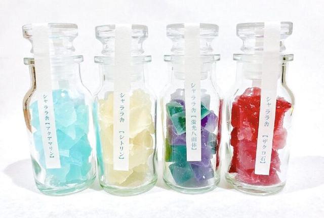 「Sha la la sha」除了販售琥珀糖,同時也是家咖啡店。店內咖啡由自家煎焙,配上可口的琥珀糖,當作下午茶點心剛剛好。招牌的小瓶琥珀糖以各種礦石為主題,常用水果泥製作出季節限定口味,加入蘇打水內,還能變做琥珀糖蘇打,而瓶裝方式更添質感,不吃的時候擺作裝飾也很棒。