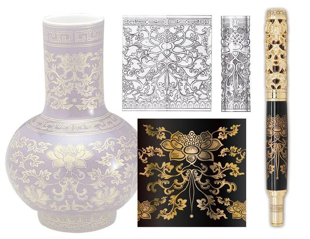 上筆蓋透過鏤空雕刻的技法,將館藏花瓶的瓶頸紋路以立體的方式展現於上筆蓋,那細膩又粗曠的質感,花形蘊含文物的柔美,雕刻卻讓其變的粗曠霸氣,上下搭配非常具有東方藝術之美感。而立體鏤空雕刻所呈現的質感,為筆增添了優柔華麗的氣息。