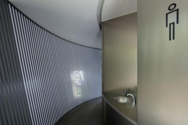 雙向出入口的環繞動線,正好將男女廁一分為二,而置中處規劃為無障礙與嬰兒護理廁所,以通用設計理念進行友善佈局,並配有機能齊全的安全扶手、嬰兒座椅等設備,兼顧安全與舒適度下,全然換新公廁樣貌。