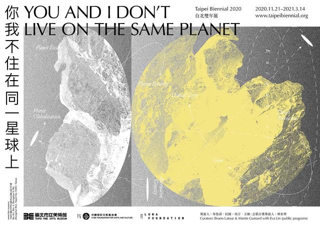 由北美館主辦的第 12 屆台北雙年展將於 2020 年 11 月 21 日至 2021 年 3 月 14 日舉行。本屆雙年展由法國哲學家布魯諾.拉圖(Bruno Latour)與法國獨立策展人馬汀.圭納(Martin Guinard)共同策展,並特別邀請臺灣獨立策展人林怡華(Eva Lin)策劃公眾計畫,將呈獻來自全球 25 個國家及地區、58 位參與者及團隊的作品。本屆雙年展的主題為「你我不住在同一星球上」(You and I Don’t Live on the Same Planet),來自於拉圖和圭納提出的假設:「全世界的人們不再對『生活在地球上的意義』有共識。當一連串衝突一觸即發,我們目睹了人們立場的分歧:似乎已放棄地球的人、試圖使環境變得更宜居的人,以及那些宇宙觀與全球化發展相斥的人等。」
