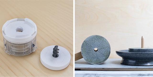 Cuzen Matcha 抹茶研磨機 有著現代化的外觀,內在則比照傳統茶道流程,毫不馬乎。在碾碎茶葉的器材上,團隊選用「陶瓷」代替石磨,陶瓷磨具刻有紋路,搭配高壓運轉,磨出的粉末,效果相當於傳統 130 磅花崗岩石磨般細緻。