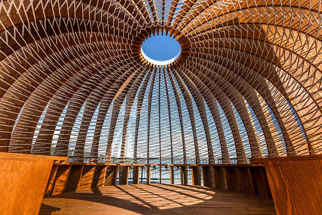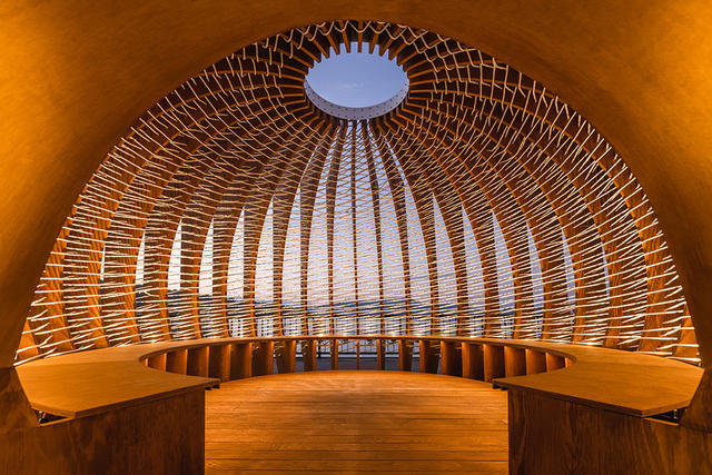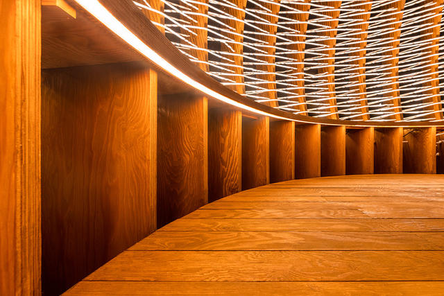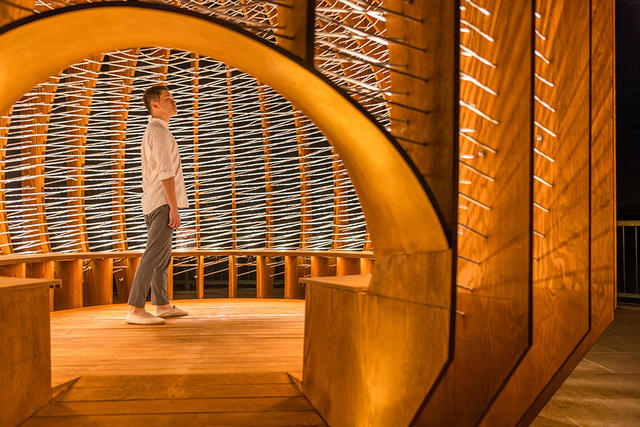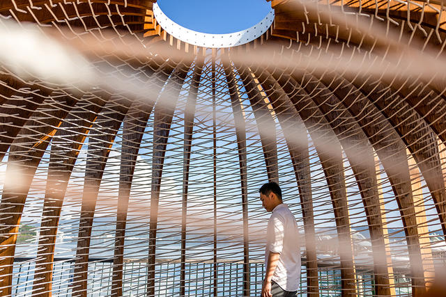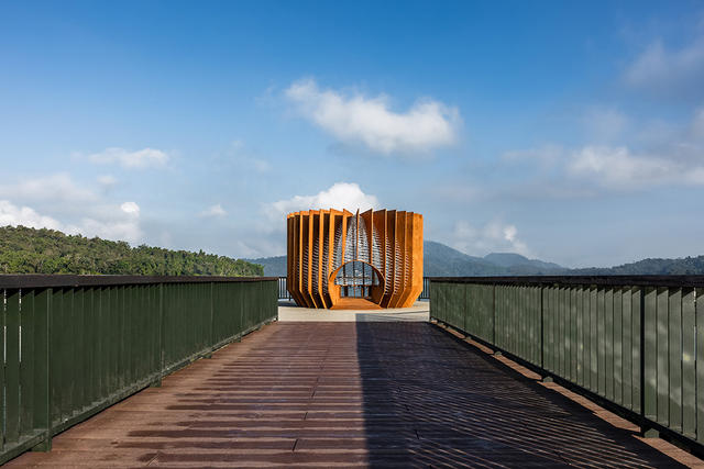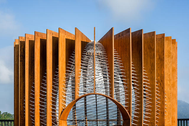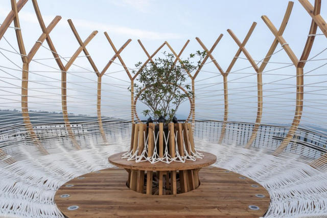 竹編工藝藝術家范承宗繼 2017 年於南投日月潭伊達邵碼頭展出竹編裝置藝術《筌屋》、2019 年《築巢計畫 I 綠繡眼》之後,同樣位址睽違 1 年再度以其擅長的自然工藝打造最新系列作品《築巢計畫 II 青背山雀》,以台灣自然山林中的鳥類生態為靈感發想,打造出當代意象的巢穴,透過精密的木板與繩索交錯結合,型塑出和諧的放射形的鏤空亭狀裝置藝術,也讓人於此停下腳步,欣賞作品的同時,也將日月潭景致盡收。