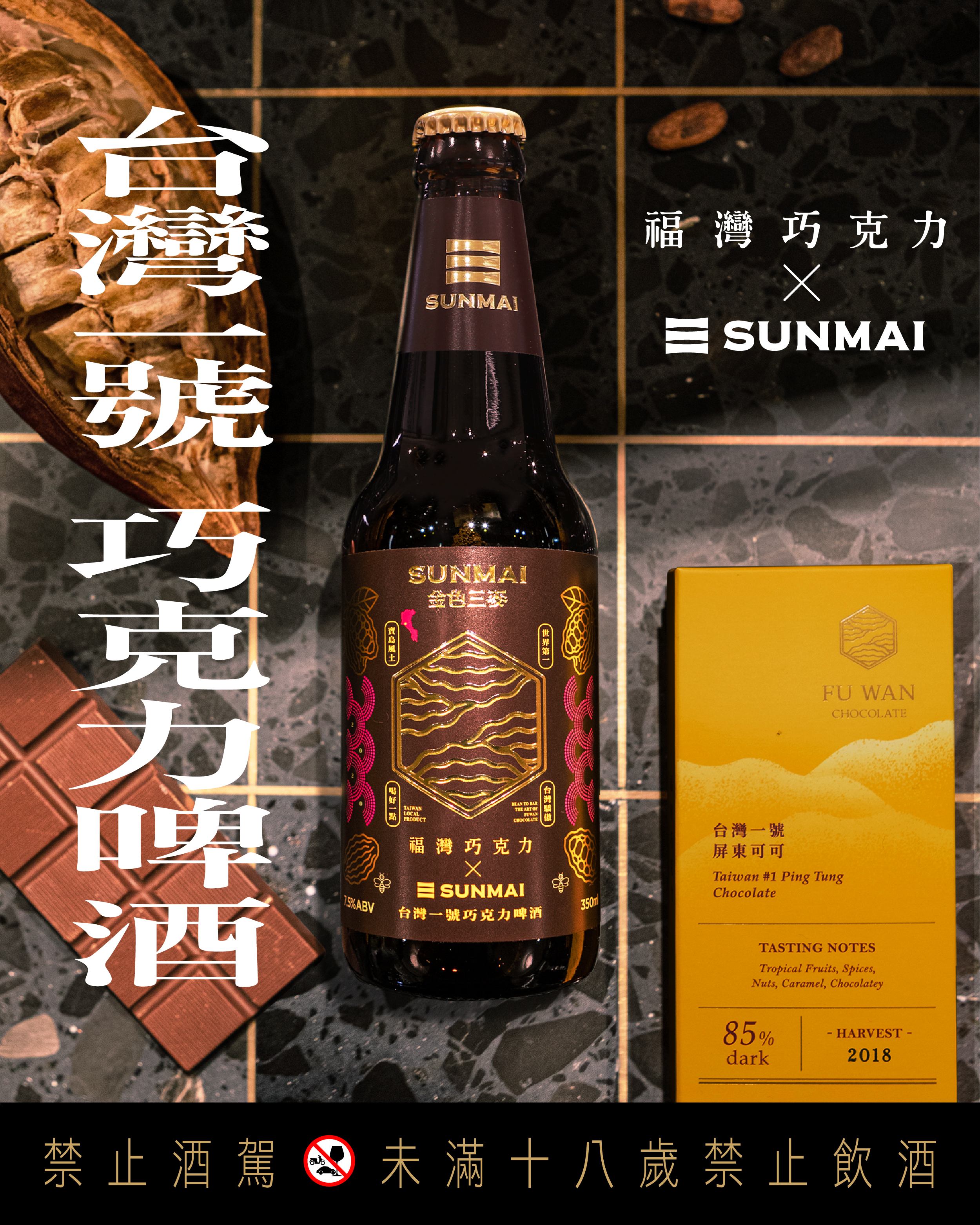 不論在產品的開發或品牌經營上,SUNMAI 和福灣都有著非常相似的共同點,兩者皆是嚴選台灣在地產物作為原物料,精釀啤酒與巧克力的製程也十分相似。在經過約 8 個月的調配、逾 20 種的試驗組合,最後選用福灣巧克力的「100% 台灣 1 號屏東巧克力」可可膏醞釀出最完美、僅 27000 瓶的限量聯名酒款!