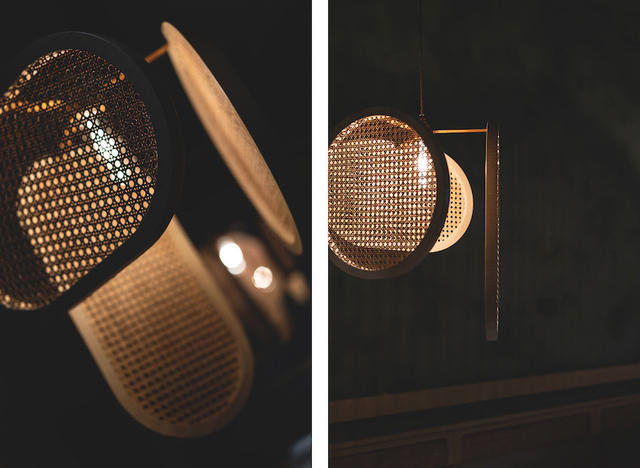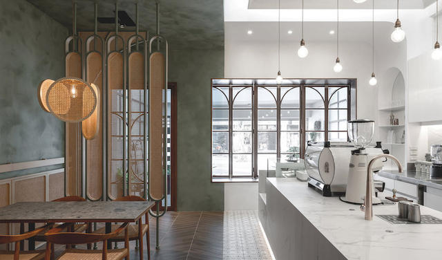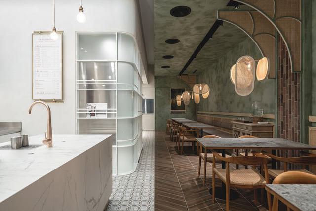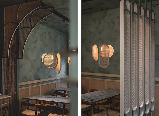 弧形線條遊走在各隅細節,低調樸實鼠尾草綠局部搭佐磚紅丁掛磚,並以 1/4 圓編織造型演釋古建築拱圈結構,猶如將座位區帶往老街裡的戶外騎樓,更藉由多重圓角收邊的藤編格屏、吊燈、座椅和腰牆設計,挹注那抹古樸情調,讓歲月鏝抹痕跡與純粹現代的大理石對立,捏塑令人屏息的迷人魅力。