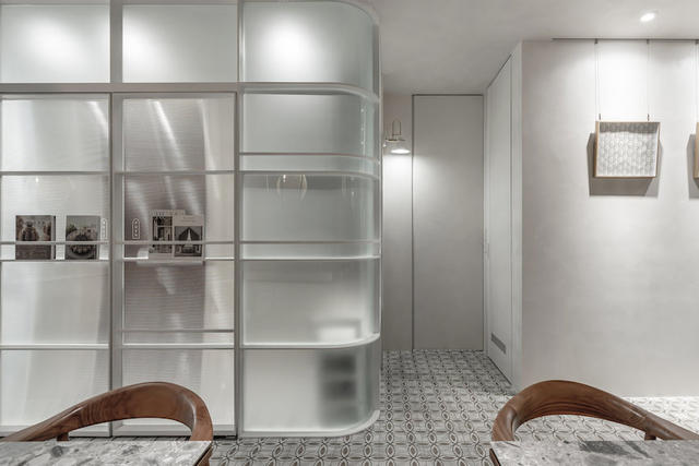 全室將店舖吧台區與座位區俐落劃分,工作區以白色、大理石及金屬元素表述純粹而簡練氣質,利用吊燈懸落的線條感帶入旁側弧角隔間,霧玻巧妙區隔工作區範疇,同步運用其透光效果結合鋁框架構,延伸一道展示書牆,在一分為二的清晰分野中,成功推演與顧客互動情境。