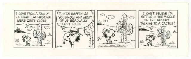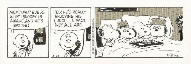 值得一提的是,在這四十五張原稿中,有一張是史努比和史派克、奧拉夫、安迪一起躺在床上吃午餐的家族半團圓照,對於這個有點「分崩離析」的家庭來說(因為不是待在沙漠就是外出旅遊),真的是非常難得的畫面啊!