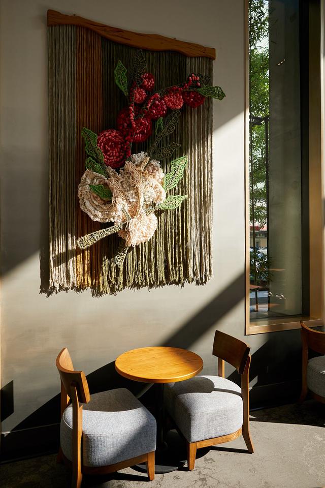 門市內中央的中島吧檯,背景以重複性銅面圓管線條,組成多層次展面,吧檯則以冷色調的大理石檯面與整體的金屬色系對比形成視覺焦點;藝術牆面部分,為在地藝術家以真實的咖啡樹枝經過特殊處理後結合鮮豔的立體藝術編織品呈現出咖啡植栽的變化,期待顧客在門市空間、藝術作品與夥伴的連結中,找到他們的專屬記憶,就如同時代寓所飯店,為客人凝結美好時光。
