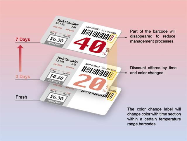 變色標籤隨時間遞延,條碼會自動消失或變色,折扣數也會增加,減少店家人力控管標籤的成本