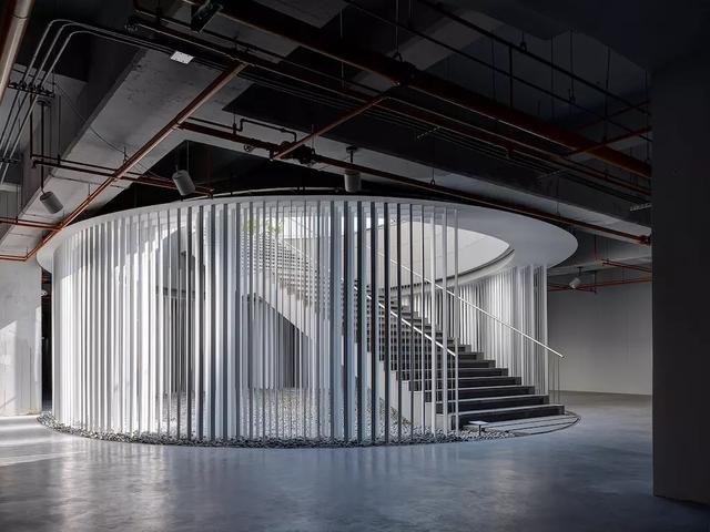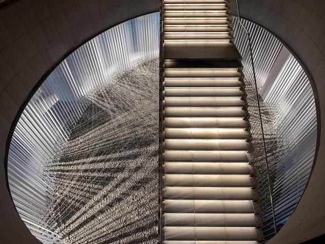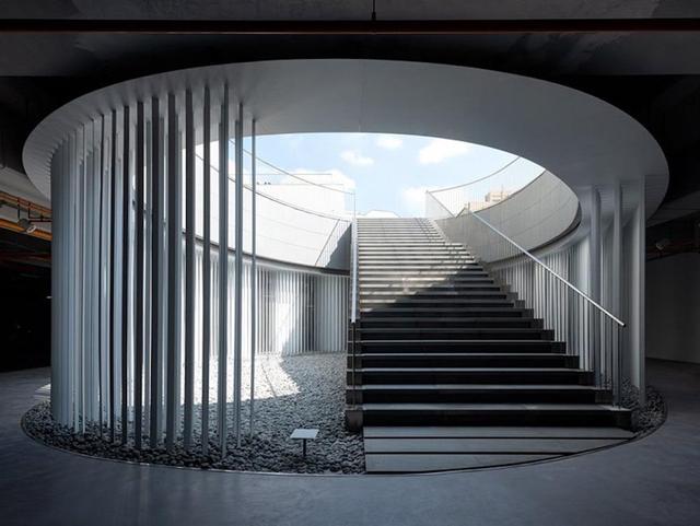 原研哉和 Noiz 試圖設計一個四維平面空間,讓自然光能巧妙地落在計算範圍內。其作法就是在階梯處打造一個橢圓形的場域,並在周圍設置如百葉窗的金屬垂直結構,當自然光灑落而下時,這個設計就像光學裝置一般形成動態的光影變化,也為黑暗的地下停車場空間帶來有趣端景。