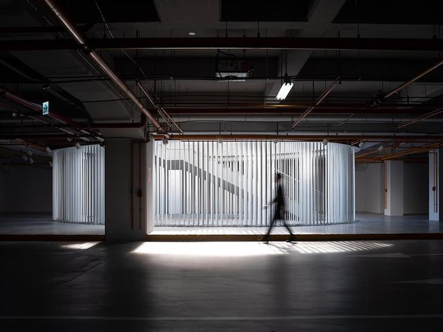「律動之影」(Shadow in Motion)位於地面和翻新的停車場階梯間,屬於地面與地下樓層的過渡場域。有別於傳統停車場出入口,由原研哉和台日設計師創辦的事務所 Noiz Architecture design and planning ( 以下簡稱 Noiz )共同設計的這個裝置,則以自然光為靈感,讓光影變化取代厚重牆面,作為過渡上下空間的重要意象。