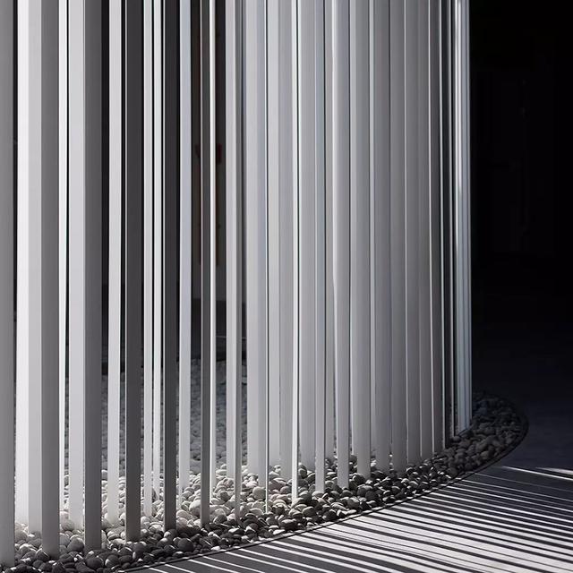 百葉窗結構由三層細薄的鋁板組合而成,整體以連續旋轉的角度排列,為了讓光線能精準地呈現在橢圓形空間內,原研哉和 Noiz 運用遊戲引擎機和 3D 雷射掃描光精密地計算光線的移動軌跡和速度,「過程中我們更精準地將誤差值控制在 1 公厘之間。」 Noiz 表示。當不同季節和時間的自然光落下,透過精巧排列的鋁板因莫列波紋(moiré effect)和橢圓排列而形成動態效果,也讓裝置呈現有機地變化。