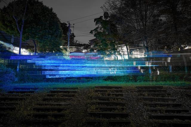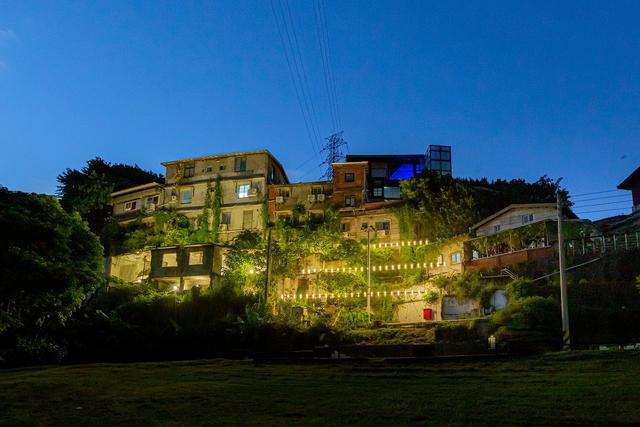 姚仲涵〈光電獸#21-痕跡掃描〉思考作品與斷面建築群的關係,原本蒼白的房舍因著閃爍的光線有了生氣,曾經因防洪線的保衛,形成的一面錯落高聳的場景,在聲光的演繹與綠色植物的環抱下,宛如天然的劇場。