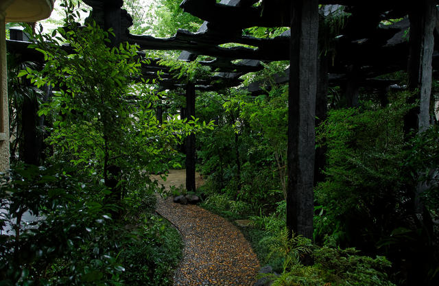 石上純也所設計的燒杉展亭「木陰雲」,顧名思義,是以經過烈火焚燒過的杉木打造而成,燒杉特有的黑色光澤與焦化氣息,搭配庭園的職務,營造出純粹而神祕的空間場所。