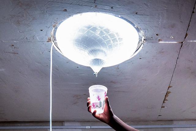 這款產品就像是個吸頂燈造型的天窗,安裝在臨時居住所的屋頂,並以管線引入海水,太陽光經過海水折射可作為室內光源的同時,也將海水蒸餾成淡水飲用。