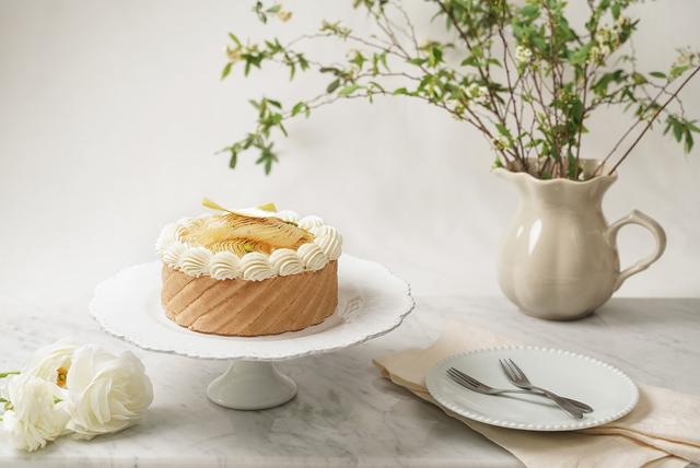 本次珠寶盒在蛋糕的造型上顛覆過去手指餅乾長條直線的舖排,改以製作成片狀、斜邊壓紋的形式,呈現優雅時尚感外,以帶有春天意象的蜜漬洋梨搭配茉莉花慕斯做主軸,清甜的洋梨飽含水分,使得蛋糕中的慕斯餡在濃郁之間帶有清爽口感,輔以檸檬柚子奶餡以及洋梨果餡的微酸提味,讓整體風味顯得分外怡人,也重新賦予夏洛特蛋糕新的樣貌。