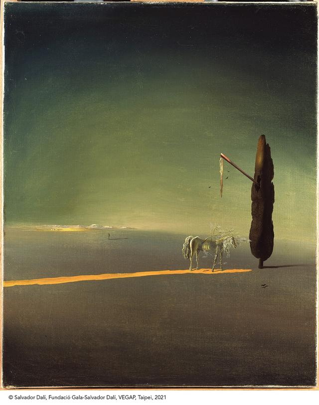 如同這幅達利在1934 年所創作的作品《 日蝕和植物性滲透 》( Eclipse and Vegetable Osmosis ),畫面中顯眼的橘色光線照著 畫面中的白馬,而白馬似乎緩慢的「變質」 成一棵 樹 達利在 1930 年代,時常將「變質」(metamorfosis)這個概念運用在創作上,所以此時期的作品會重複看到人物轉換成動植物、石頭或家具等造型的畫法。