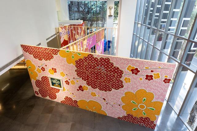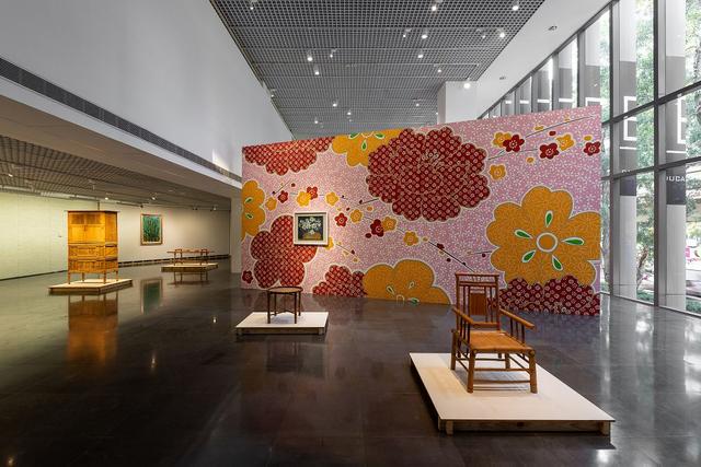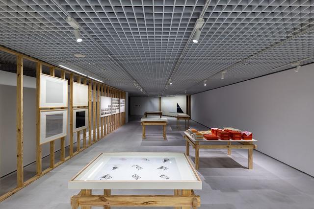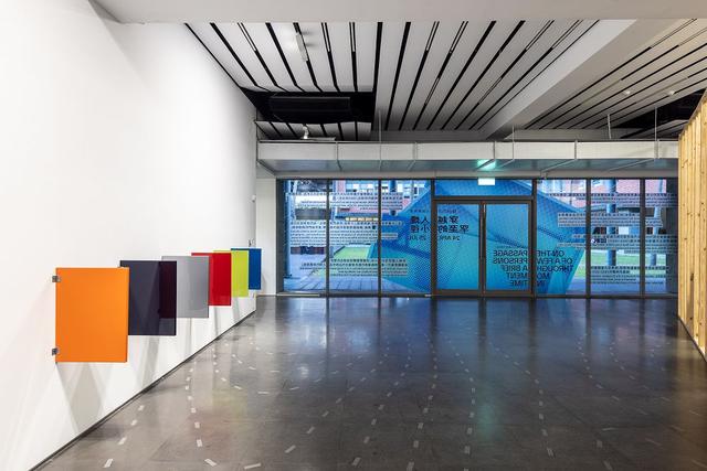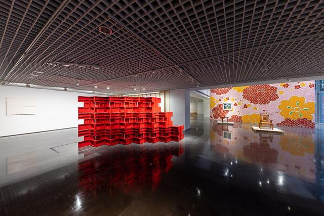 策展概念貫穿於展覽架構,拔高直上 3.5 公尺的林明弘〈展位〉不僅是作品,同時也是展示架構,展覽中多數作品懸掛於林明弘設計的展牆或平台之上,而非美術館白牆。