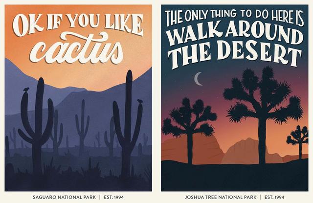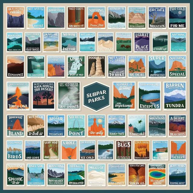 「Subpar Parks 是寫給國家公園的情書。」Amber 在旅遊時發現美國 62 個國家公園中都有一個 1 星級評價時,她便想著若能用有趣的方式著手說明,一定會非常有趣。於是為了將這樣一系列的創作增添些許幽默感,她在每一幅插畫設計中加上了遊客在網絡上留下的最差評論,以正面的方式評價負評。