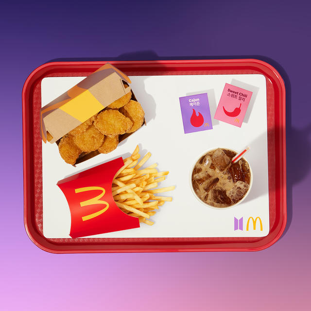 「THE BTS MEAL」包括10塊麥克鷄塊、中份薯條、中杯冷飲,以及韓國直送的甜辣醬與肯瓊醬,特定包裝與期間限定沾醬販售期間自6月9日起至6月2