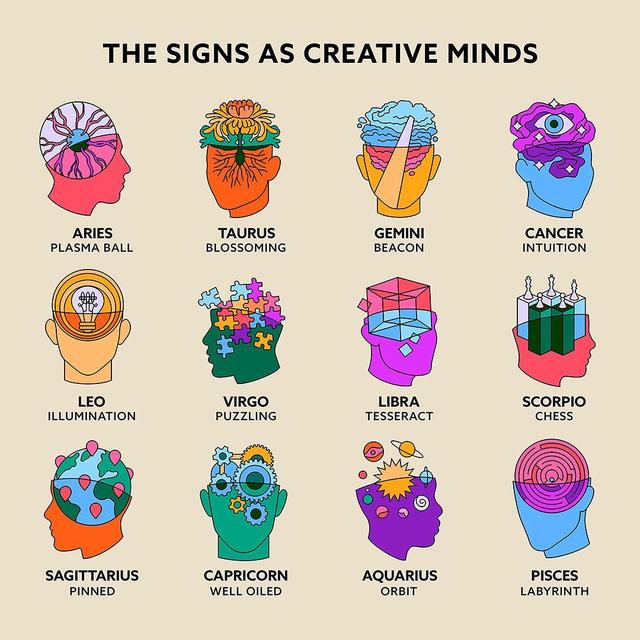 5 月份則是「12 星座的創意思維」,Berlin Michelle 將各個星座的大腦拆解,透過精緻的圖像設計,每個腦袋都成為充滿創意與巧思的標誌。比如白羊座的腦袋是顆等離子球、天蠍座的是西洋棋、雙魚座則是超混亂的迷宮、雙子座是從天而降的信標,感行的巨蟹座則是要相信自己的直覺。