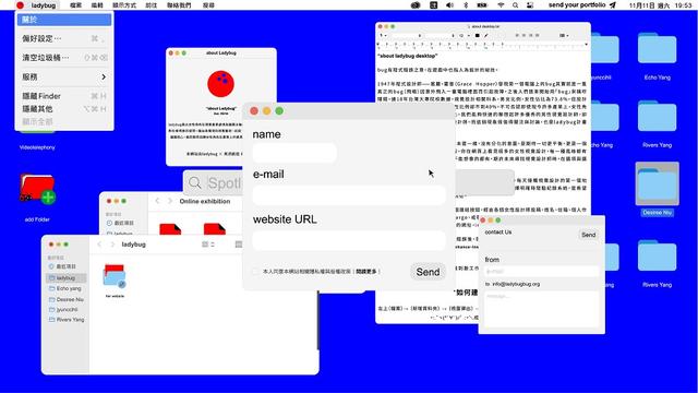 「Ladybug做過很多嘗試,既然線下的乘載有限,不如嘗試線上串連,探索其他可能。」李君慈形容「online desktop」像是一場集體的網路行為藝術,以「2021」為系統命名是為了記錄時間感,而「桌面」設計則是象徵設計工作者每天接觸視覺設計的第一個畫面,「我相信時間的推移會走向更佳的平衡,如果網站能保存下來,未來就能記得現在」李君慈說。